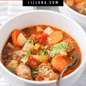 Albondigas is Spanish for “meatballs”. It’s also known as Caldo de Albรณndigas but its origin goes back to Spain and has some Arabic influences. Great Grandma’s traditional Mexican meatball soup has a flavorful broth base and is filled with tomatoes, veggies, and homemade meatballs (filled with spices and rice).