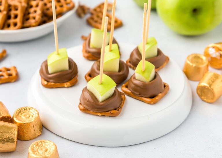 These bite-sized treats feature miniature apples on top of a gooey Rolo and a crispy salty pretzel for sweet and salty perfection. Whether you’re hosting a holiday party or enjoying a small snack at home, they’re sure to be a hit with kids and adults alike!