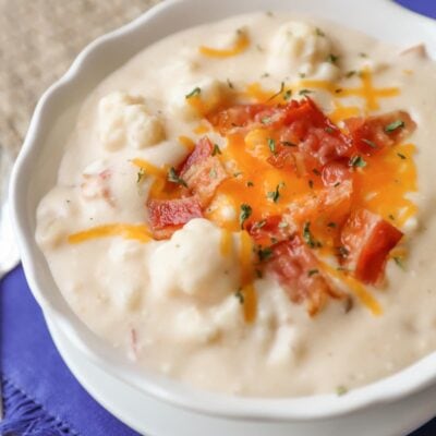 Cheesy and Delicious Cauliflower Soup. One of our favorite soup recipes to enjoy all year long! Ingredients include cauliflower, potato flakes, cream cheese, cheddar cheese, and bacon!