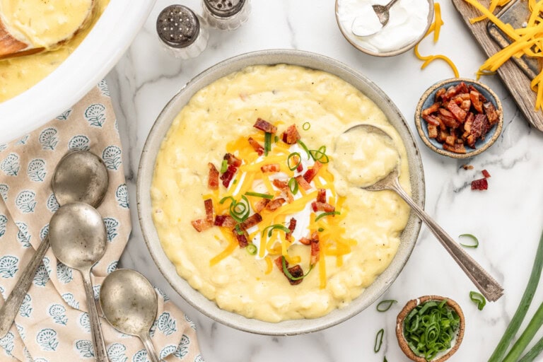 Creamy, cheesy potato soup is the ultimate comfort food – perfect for a cozy night in. This crock pot recipe makes it even easier to enjoy, plus it happens to be the kids’ favorite soup recipe.