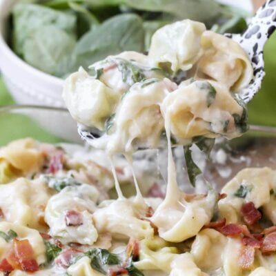 We’ve always loved Tortellini and have used it in so many recipes here on the site (including our Italian Tortellini Soup and Tortellini Salad). We knew we’d love this recipe considering that it’s covered in cheese, bacon and spinach. And because the tortellini is already filled with cheese, it’s kind of a no-brainer to love this double-cheesy baked tortellini goodness.