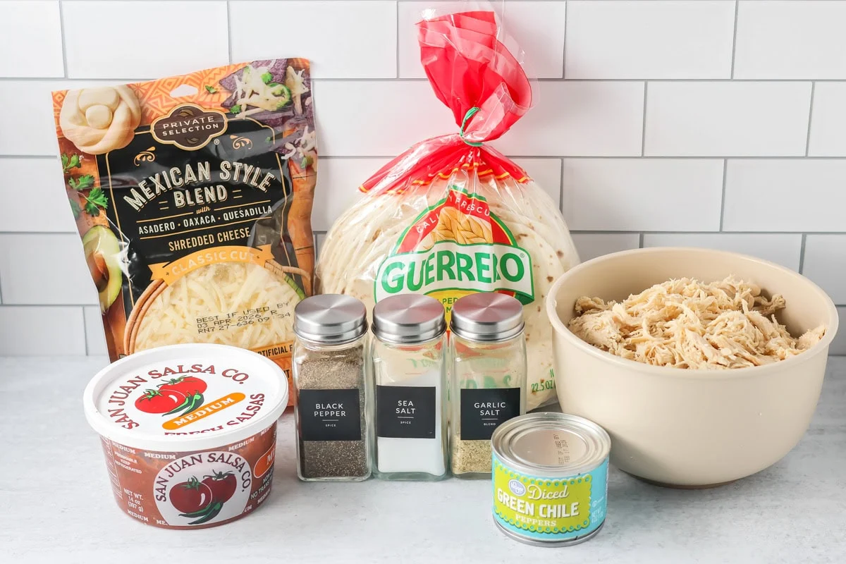 FILL. In a medium bowl, combine 3 cups cooked shredded chicken, 1 cup shredded Mexican blend cheese, ยฝ cup salsa, 1 can diced chiles, and garlic salt with parsley flakes and pepper, to taste.