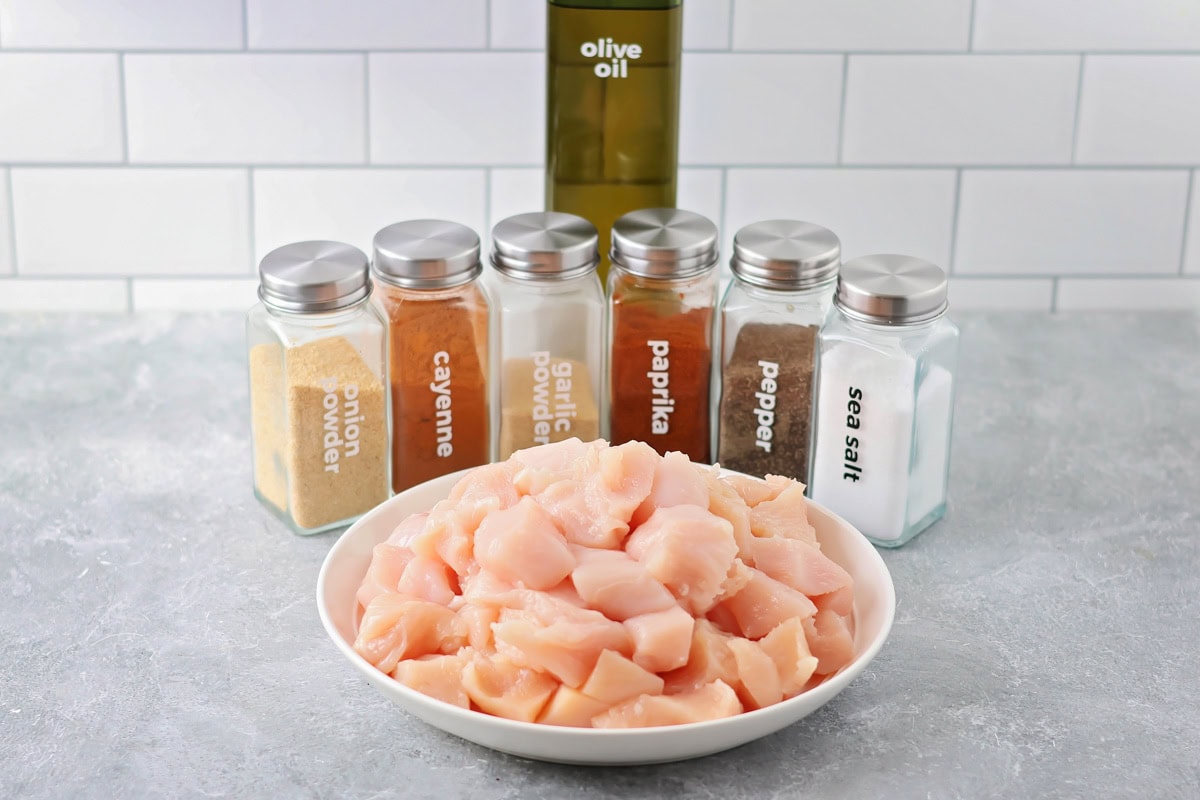 CHICKEN. Place 1 pound of cut chicken into a bowl. Season with 1 teaspoon of garlic powder, 1 teaspoon onion powder, ½ teaspoon paprika, ¼ teaspoon cayenne pepper, and ½ teaspoon of salt and ½ teaspoon black pepper; toss to combine.