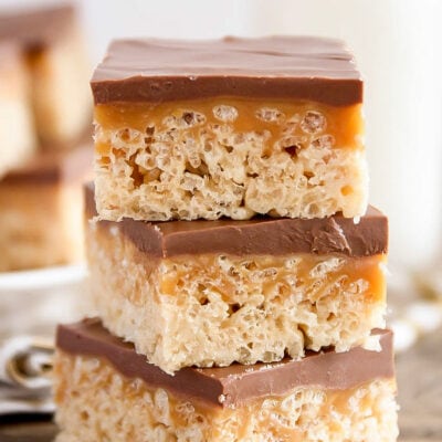 For quick and easy desserts we love whipping up a version of a rice krispie treat like these Chocolate Caramel Rice Krispies Treats. Crack Rice Krispies, Lucky Charm Treats, and Rice Krispie Wreath are also some of our favs!