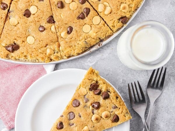 Today’s chocolate chip cookie cake is similar to our famous Pizookie in that it’s a twist between a cake and a our favorite Chocolate Chip Cookie. It’s not as gooey and can be served warm or cold but is just as delicious.