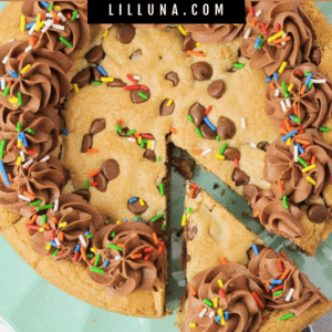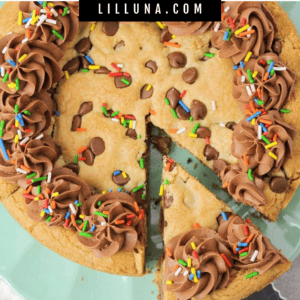 This Cookie Cake is the easiest way to get the best parts of a chocolate chip cookie and a birthday cake all in one. It bakes up thick, soft, and chewy with melty chocolate chips, then you top it with fluffy chocolate frosting and sprinkles for that classic celebration look.