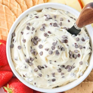 Freeze this cream cheese chocolate chip dip in a freezer-safe airtight container for up to 1 month. The freezing and thawing process may alter some of its original texture. Thaw in the fridge and then gently stir to re-incorporate the ingredients. If needed, add 1-2 teaspoons of heavy whipping cream to help smooth it out.