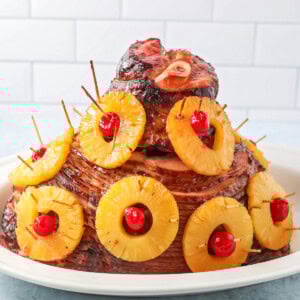 - Place ham in the prepared foil-lined baking dish. Baste the ham on all sides (even going in between slices, if possible) with the syrup. Then, add pineapple slices on top of the ham using toothpicks. Place cherries into the centers of each ring and secure with toothpicks. Re-baste the top of the ham where the pineapple rings are with the syrup mixture. There should be a little syrup left over – do not discard, but set aside.