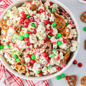 During the Christmas season, we love to get together with family, play games, watch holiday movies and eat yummy treats. One of our favorite holiday desserts is Christmas popcorn. It has M&Ms and bits of candy cane smothered in white chocolate with a red and green drizzle. It’s pretty much a peppermint version of our White Chocolate M&M Popcorn.