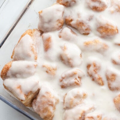 When you’re ready to eat them, thaw in the fridge. Heat oven to 350 degrees F and bake for 10-12 minutes or until bites have finished baking. Cover with glaze and enjoy!