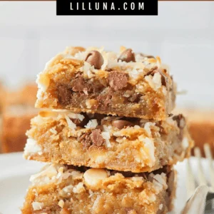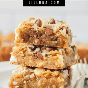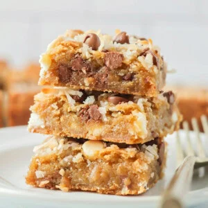 These bars have a rich brown sugar flavor, a soft and thick cookie-bar texture, and plenty of chocolate chips and coconut in every bite.