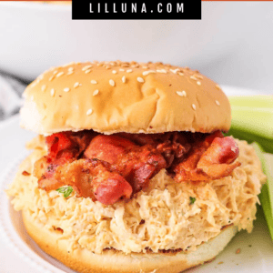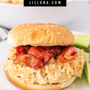 My kids ask for these sandwiches all the time, especially when topped with crispy bacon and served on soft buns. And if you love this crock pot favorite, also try Slow Cooker BBQ Chicken, Buffalo Chicken Sliders and Pulled Pork.