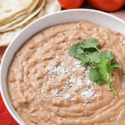 Homemade refried beans are a frequent dish at our house with all the Mexican recipes we make! It’s perfect served as a dip, side, or filling for burritos and tacos!