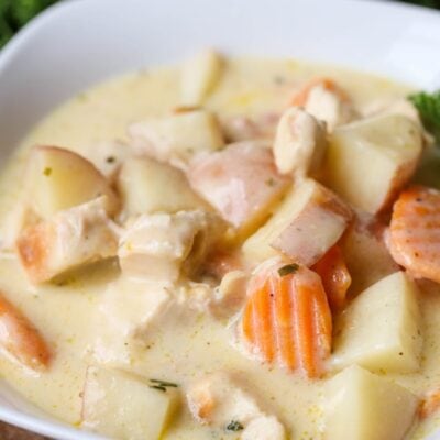 This stew can just as easily be made on the stovetop. Just melt the butter in a large pot and stir in the veggies coating them with butter. Add the chicken too. Mix the soup, milk, sour cream, broth and ranch dressing mix in a bowl and then add it to the pot. Bring to a boil and then let simmer for 45 minutes.
