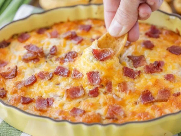 It’s really a bowl of comfort food with all of that cheesy savory flavor. You can dip in your favorite crackers or chips, but our go-to is warm French Bread and Homemade Tortilla Chips.