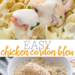 EASY Chicken Cordon Bleu recipe – delicious, breaded chicken filled with ham and cheese. Serve over pasta, rice, or veggies, for a filling meal.