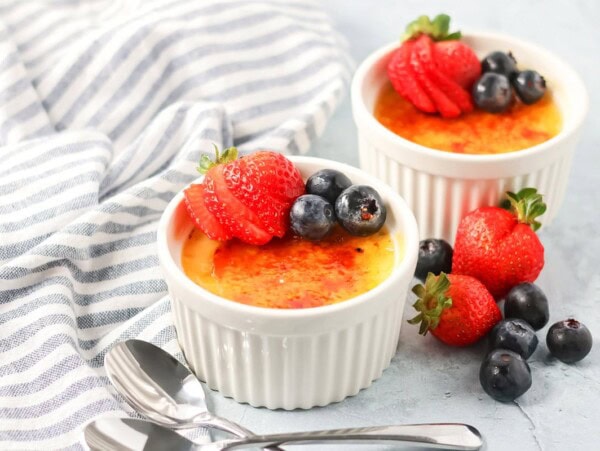 - Place the ramekins into a tall-sided baking pan. Add 2 inches of boiling water to the pan. Bake at 350°F for about 45 minutes.