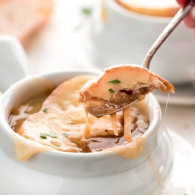 Soup is such a great meal or appetizer to make during the cold winter months. When it’s chilly, I make soup like Creamy Chicken Noodle Soup, Black Bean Soup, or this classic French Onion Soup. French onion soup is super simple and very inexpensive to make. There are only a small handful of ingredients involved – it’s pretty much just onions, butter, beef broth, some seasonings, and then French bread and cheese on top.