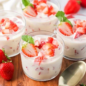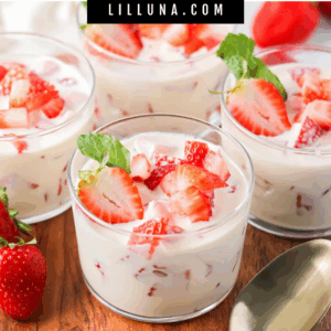 FILL & CHILL. Add ยฝ – ยพ cup diced strawberries to a cup or dish, then top with ยฝ cup cream mixture. Refrigerate for at least 1 hour before serving. Garnish with a fresh mint leaf.