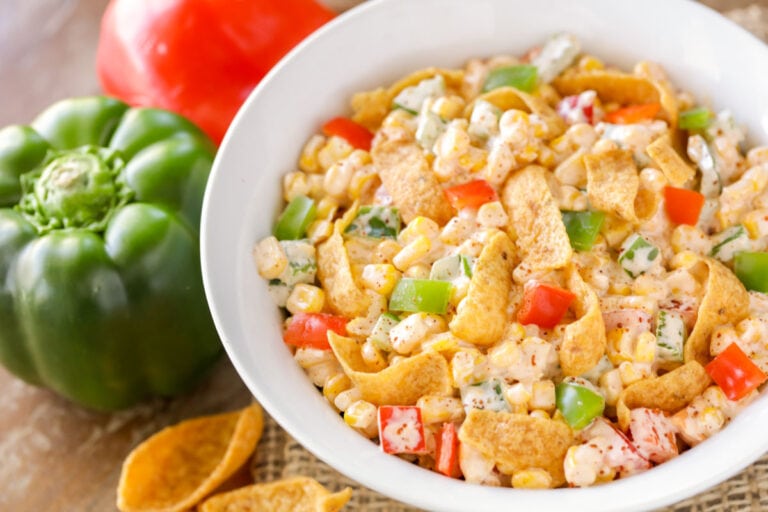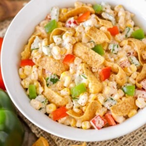 Have you tried Frito corn salad before? It’s creamy, crunchy, so easy and packed with sweet corn, colorful peppers, and a zesty taco dressing. It comes together in minutes and disappears even faster.