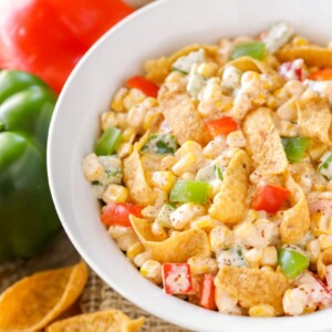 If you are a fan of salty and tasty Fritos and a bit of spice, then this Frito corn salad is for you! It comes together easily and quickly like some of these other salads: Summer Corn Salad, Chicken Taco Salad or our Southwest Salad.