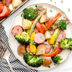 When we are focusing on healthy dinner ideas we believe baked is better than fried and there is always room for more veggies! Our favorite veggie-packed dish is Sheet Pan Sausage and Veggies .