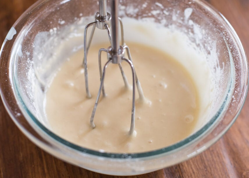BATTER. In a large mixing bowl, using a hand mixer, beat the egg whites and sugar on high speed for 2 minutes. Add the melted butter, vanilla, almond extract, and water, mix until incorporated. Add the flour and cornstarch, mix just until combined.