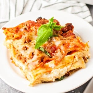 Our family's favorite lasagna recipe – not only because it's delicious but because it's so EASY! With beef, Italian sausage, three cheeses, and tons of seasonings, you know this recipe is going to be a hit!