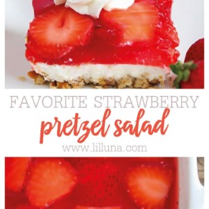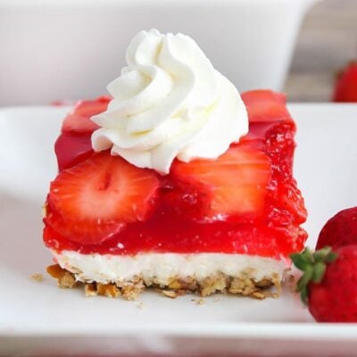 This classic treat is always a crowd pleaser with a pretzel crust, cream cheese layer and strawberry jello topping! Strawberry Jello Pretzel Salad is the ultimate combination of sweet and salty.