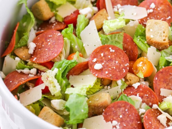 - Pizza salad is hearty & refreshing. All of the flavors of pizza are served on a bed of greens and topped with a homemade herb dressing!