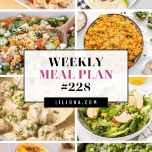 Each week, I share with you a FREE meal plan that consists of 5 dinner ideas (Monday-Thursday plus one Weekend meal), 5 side dishes, and 1 dessert!