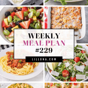 Each week, I share with you a FREE meal plan that consists of 5 dinner ideas (Monday-Thursday plus one Weekend meal), 5 side dishes, and 1 dessert!