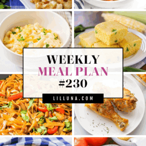 Each week, I share with you a FREE meal plan that consists of 5 dinner ideas (Monday-Thursday plus one Weekend meal), 5 side dishes, and 1 dessert!