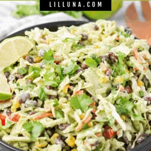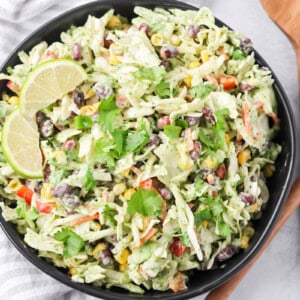Crisp slaw, peppers, beans, and corn get tossed in a creamy cilantro ranch dressing that is tangy, herby, and totally addicting. Even the kiddos loved this Mexican coleslaw recipe and have already asked when we will be having it again.