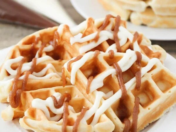 - Remove from oven and frost with the cream cheese frosting from the cinnamon roll package (if desired). You can also top with your favorite syrup.
