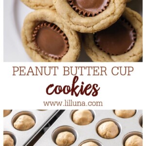 REESE’S. Once they come out of the oven, put an unwrapped peanut butter cup in the middle of each cookie and press lightly. Let the cookie cups cool before removing from pan.