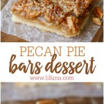 Make pecan pie bars as a dessert for the holidays, or a homemade neighbor gift. Anyone who likes pecan pie (and even those who don’t!) LOVE these Pecan Bars. For more delicious bars try Millionaire Bars, Churro Cheesecake Bars, and Pumpkin Cream Cheese Bars.