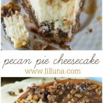 If you love pecan pie, you will LOVE pecan pie cheesecake. It takes the best of both and marries them into one yummy dessert! For more cheesecake try White Chocolate Raspberry Cheesecake or Lemon Cheesecake with Raspberry Sauce.