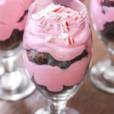 There are layers of brownie pieces and peppermint cream and it’s all topped with crushed candy canes. If you want an even softer topping you can use Andes Peppermint Crunch Pieces which are great too!! Bottom line this is a simple and delicious dessert that looks so beautiful layered in a mason jar or goblet. If you use mason jars, you can even add some twine and maybe a small bell to adorn the top. No matter what you do, this treat is sure to be a hit with those that try it!
