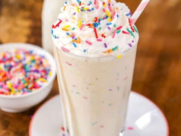 - Milk (½ cup) – Milk thins out the shake just enough for sipping. Whole milk makes a creamier shake, but any kind of milk works.