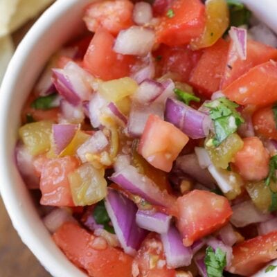 Everyone loves a good pico recipe! This versional calls for tomatoes, green chilis, onion, cilantro, lime juice and salt and is SO addicting!