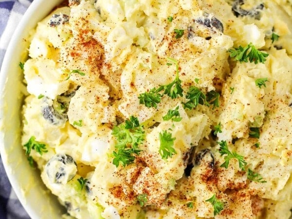 This is very similar to the way I make it! I use green olives and olive juice in mine! And everyone here loves it’s! I love potatoe salad! And yours looks wonderful might have to whip up a batch this weekend!