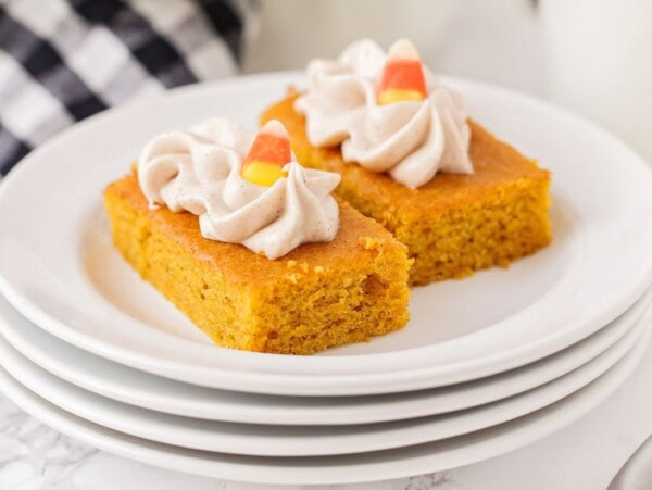 We like to serve this pumpkin dump cake recipe warm, but you can store leftovers, covered, in the fridge. It should last for at least 2 days.