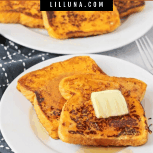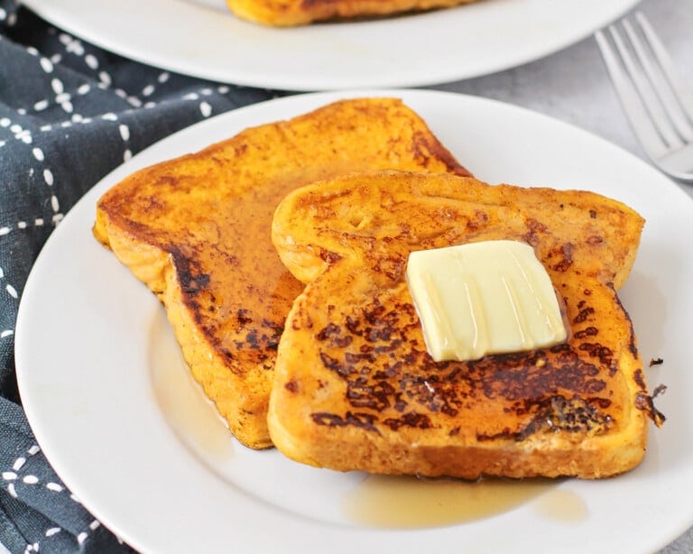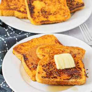 Our kids are BIG fans of French Toast in all its variations. This fall favorite is here to make your breakfast (or brunch!) feel like a cozy autumn dream, no matter the season! We soaked thick slices of Texas toast in a rich, custardy batter infused with warm pumpkin puree and a blend of fall spices like cinnamon and nutmeg.