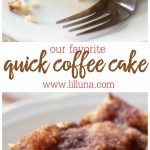 One of my FAVORITE things to make for a breakfast get-together is coffee cake! This next recipe is quick and it is so buttery and cinnamon-y that everyone loves it. My mom first made it for me when I left for a summer camp as a teenager and I remember thinking, “I need to have this recipe in my life!” It was just too good.