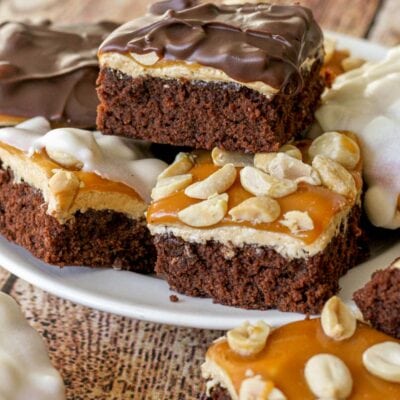 This is basically a Snickers candy bar but in brownie form! It all starts with a brownie base (you can use a box mix from the store, or make your favorite Homemade Brownies), and has layers of nougat, caramel, and roasted peanuts.