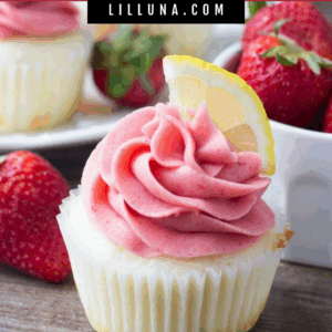 These have the perfect flavor combination. The hint of tanginess and fresh lemon flavor, moist cupcake crumb, and creamy strawberry frosting – I hope you love them as much as I do!