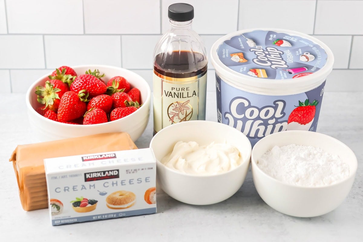 - Add 12 strawberries and vanilla to a blender or food processor and blend until smooth. Add cream cheese, Greek yogurt and powdered sugar and mix until combined well. Pour into a bowl and fold in half of the whipped cream until combined.