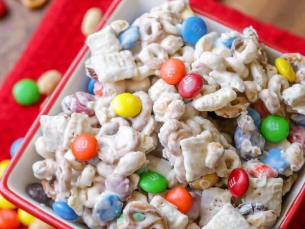 - In a medium bowl, add peanuts, cashews, M&Ms, and raisins.