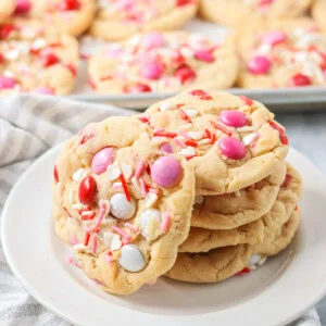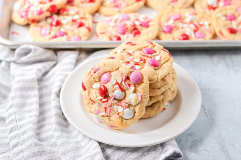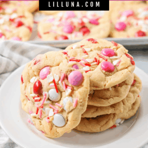 These Valentine’s Day cookies are soft, chewy, and studded with pink, red, and white M&Mโs. They make the cutest Valentine’s treat for classroom parties and family night.